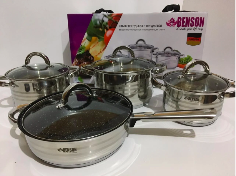 BN-194 Набор кастрюль нерж. 8пр. 2,1л 2,9л 3,9л+сковородка