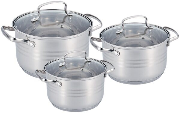 Набір посуду Benson BN-201 - це кухонний набір для приготування їжі, що складається з 3-х каструль та 3-х кришок. Каструлі такого набору виготовлені з високоякісної сталі, мають 5-шарове дно, що забезпечує чудовий розподіл та збереження тепла.
