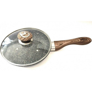 Сковорода виготовлена з якісного литого алюмінію, що характеризується високою теплопровідністю та має покриття з ранитної крихти. Така поверхня даного товару забезпечує високу міцність і довговічність і є антипригарною, стійкою до подряпин. Тришарове покриття покращує якість приготовленої їжі, т.к. дозволяє практично не використовувати жири. Зовнішня поверхня сковороди покрита гранітною крихтою. Цей посуд пристосований для приготування на всіх сучасних типах плит, у т.ч. індукційних. За допомогою зручної ручки з бакеліту сковороду можна безпечно переміщати. Скляна кришка опуклої форми має ручку тон ручки сковороди. Посуд легко миється у теплій воді за допомогою м'якої губки. Має оригінальний вигляд.