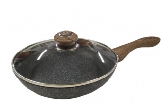 Сковорода виготовлена з якісного литого алюмінію, що характеризується високою теплопровідністю та має покриття з гранітної крихти. Така поверхня даного товару забезпечує високу міцність і довговічність і є антипригарною, стійкою до подряпин. Тришарове покриття покращує якість приготовленої їжі, т.к. дозволяє практично не використовувати жири. Зовнішня поверхня сковороди покрита гранітною крихтою. Цей посуд пристосований для приготування на всіх сучасних типах плит, у т.ч. індукційних. За допомогою зручної ручки з бакеліту сковороду можна безпечно переміщати. Скляна кришка опуклої форми має ручку тон ручки сковороди. Посуд легко миється у теплій воді за допомогою м'якої губки. Має оригінальний вигляд.