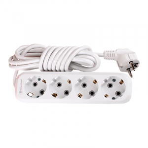 Подовжувач 4 гнізда 5м із заземленням широко використовується в міських квартирах, кабінетах, офісах, заміських будинках і тому подібне. Він виготовлений з білого високоякісного АБС пластика, контактна група захищена особливим покриттям з матеріалу поліаміду, який запобігає горінню. Пристрій служить для під’єднання різних побутових електричних приладів на відстані до п'яти метрів від стаціонарної електророзетки. Вимикача/вмикача на корпусі немає. Шнур подовжувача має подвійний ізолюючий шар з полівінілхлориду, і при цьому досить еластичний. Вилка стандартна і підходить як до розеток вітчизняного і європейського типу і виконана з ПВХ рецептури, стійка до механічних навантажень і окислення.