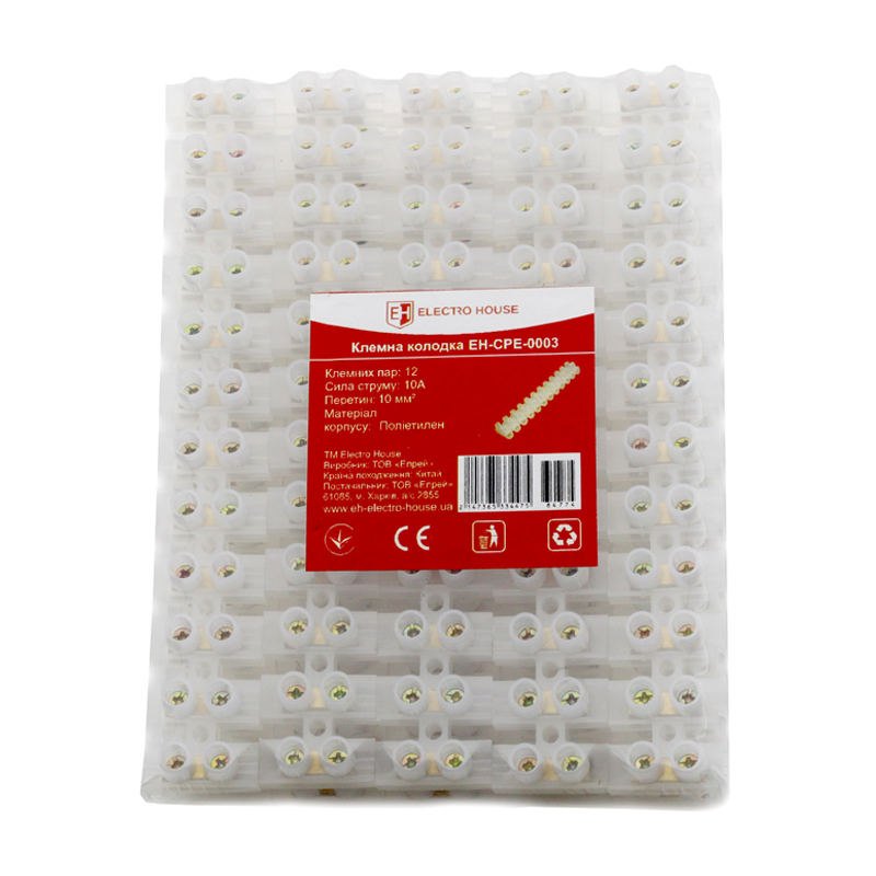Клемна колодка 10A 10mm2 ПЭ EH - CPE - 0003 від виробника ElectroHouse призначена для швидкого і надійного з'єднання між собою електропроводів. По конструктивним особливостям клемний блок має дванадцять латунних пар електроконтактів, поміщених у високоміцний вогнетривкий корпус з поліетилену. Кожну таку пару можна відділяти і використати окремо. Щоб з'єднати електрокабеля між собою, треба їх струмопровідні жили завести з двох сторін клеми і затиснути міцно гвинтами. Таким чином, можна створювати електроз'єднання дротів з різних металів - алюмінію або міді. Термінал легко вміщується в розподільний ящик і буде дуже корисним при електромонтажі освітлювального і іншого устаткування.