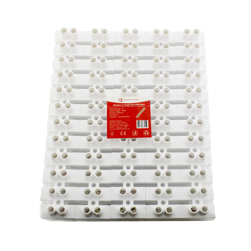 Клемна колодка 100A 40mm2 ПЭ EH - CPE - 0009 від торгової марки ElectroHouse - необхідний електротехнічний виріб для швидкого з'єднання електропроводів з алюмінію або міді. Можна виділити той факт, що є можливість з'єднати дроти з різних металів без прямого дотику один з одним. За конструктивними характеристиками термінал має дванадцять пар електроконтактів з латуні, які містяться у вогнетривкому і високоміцному корпусі з поліетилену. Кожну з цих пар можна використати окремо. Для того, щоб утворилося електроз'єднання, треба захищені проводки з обох боків вставити в клему і затягнути гвинтами. По своїх розмірах клемний блок дуже компактний і його легко помітити в розподільному ящику або монтажній коробці. В умовах експлуатації проявляє високі зносостійкі і довговічні властивості.