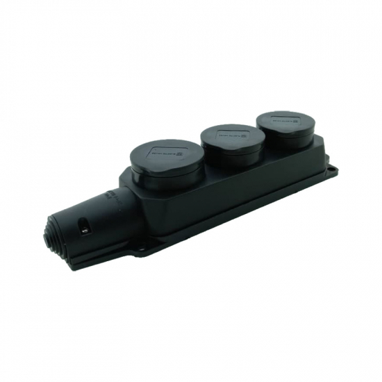 Колодка із заземленням і кришкою на 3 гнізда Каучук застосовується у виробничих або інших сферах де умови експлуатації можна назвати агресивними. Кожна з розеток обладнана кришкою, що виключає за відсутності вилки споживача попадання сторонніх предметів в струмоведучі частини. Також вологозахищена, бризки води, що потрапляють на конструкцію під будь-яким кутом, не заподіюють небезпечних наслідків. Усі затиски, клеми, гвинти надійно фіксують електропровід. Безпечна у використанні. Виконана в чорному кольорі. Застосовують в приміщеннях автомобільного миття, майстерень, будівництвах, виробничих цехах. Стійка до великих навантажень і перепадів мережі.