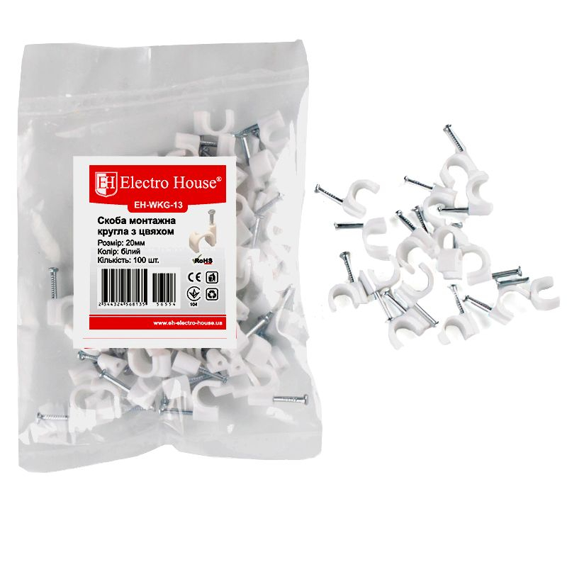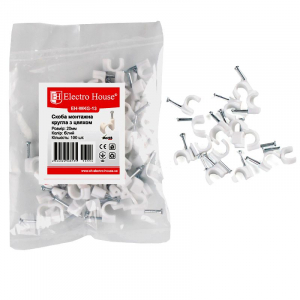 Кліпса з цвяхом 18 мм EH - WKG - 12 від виробника якісних електротоварів ElectroHouse володіє найбільш найвищими міцними, зносостійкими і вогнетривкими властивостями. Працює вона для міцної і частої фіксації електропроводів і використовується нерідко при прокладенні електромереж, при підключеннях різного оснащення і при монтажі освітлювальних приладів. В основному її монтують до стелі або стіни за допомогою укомплектованого в неї цвяха, який зроблений із сталі з протикорозійним напиленням. Дріт лягає в її особливе півкільце, яке виготовлене із дуже витривалої до зовнішніх дій, пластмаси, що володіє протипожежними характеристиками. В умовах експлуатації представляє себе досить надійним і довготривалим продуктом.