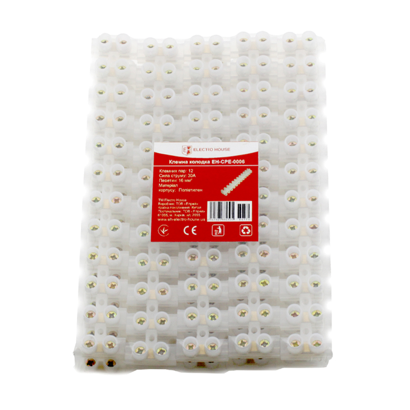 Клемна колодка 30A 16mm2 Поліпропілен EH - CPP - 0016 від торгової марки ElectroHouse служить в якості простого і надійного з'єднувача електропроводів з різних металів (міді і алюмінію). Термінал часто застосовують при підключенні нового освітлювального або іншого устаткування, а також при прокладенні електромережі. Завдяки своїм невеликим розмірам клемний блок легко вміщується в розподільному ящику або монтажній коробці. Користуватися їм можливо як на вулиці, так і в приміщенні, тому що він витримує багато зовнішніх впливів (перепади температур, вологість, вібраційні і механічні навантаження і т. д.). По конструкції він складається з дванадцяти контактних пар з латуні, які поміщені у вогнетривкий корпус. В умовах експлуатації характеризується високими міцними, зносостійкими і довговічними властивостями.